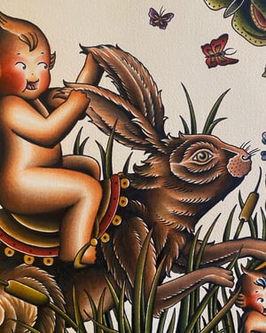 This is a print preorder for the painting Kewpie Riders. These prints measure 18x24 inches and are printed on high quality archival water color paper. Each print will be shipped in a reinforced tube to ensure safe arrival to its new home.
